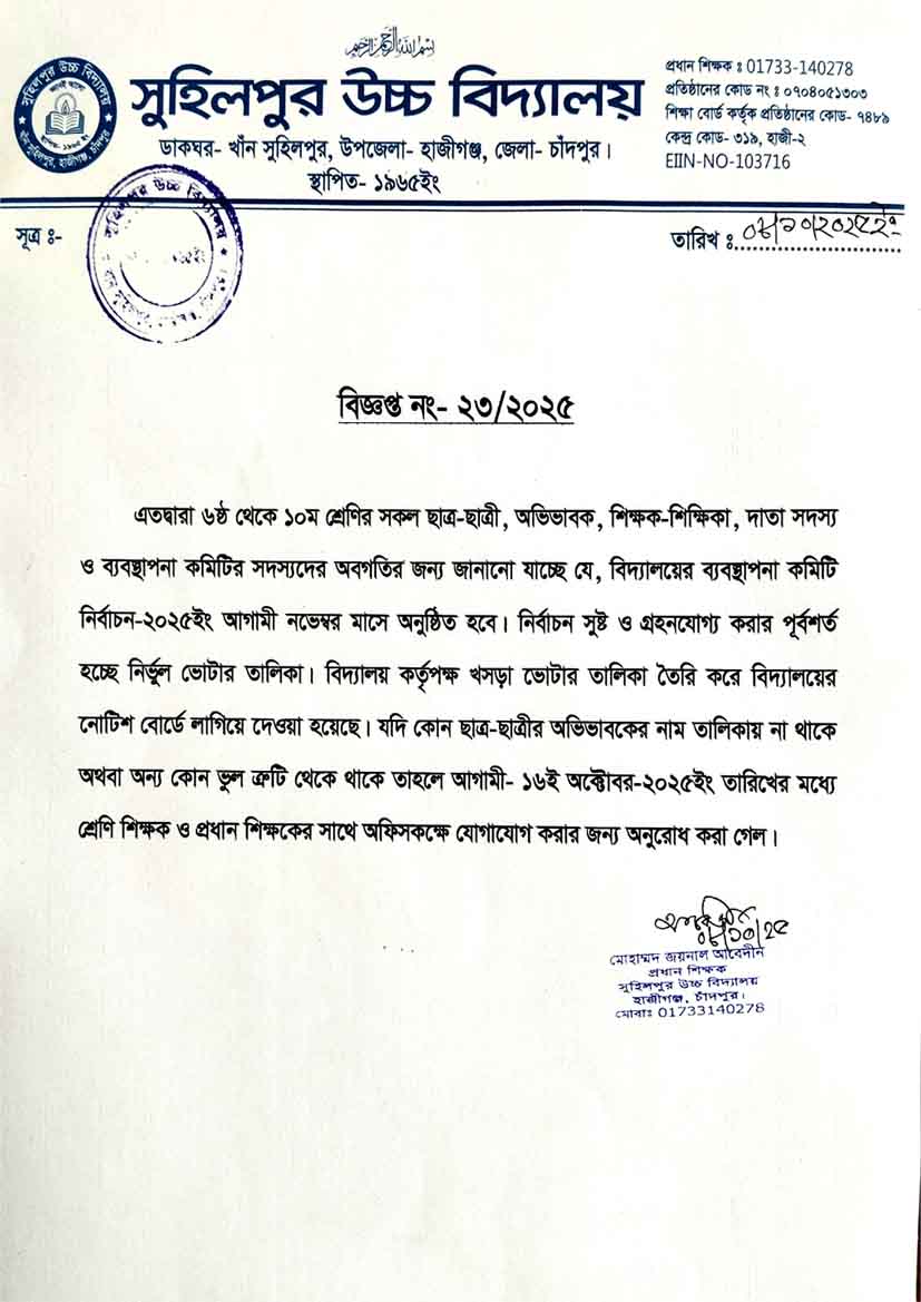 বিদ্যালয় ব্যবস্থাপনা কমিটি নির্বচান ২০২৫এর জন্য খসড়া ভোটার তালিকা প্রস্তুত সংক্রান্ত।