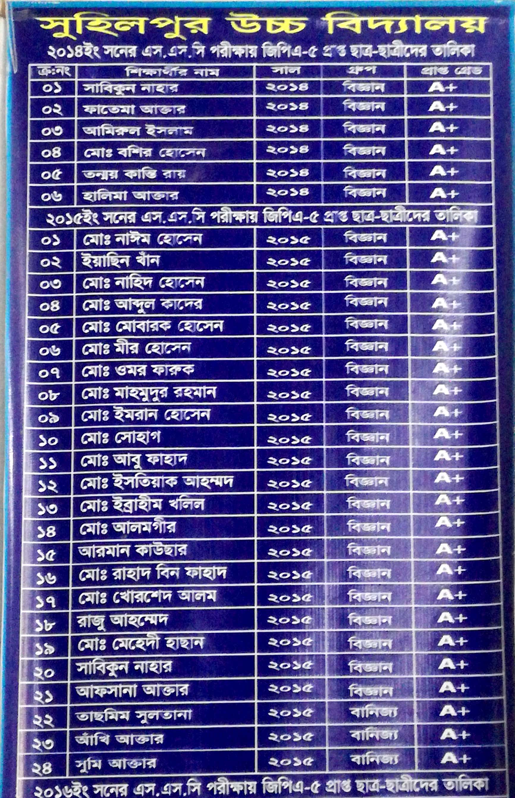 সুহিলপুর উচ্চ বিদ্যালয়ের ২০১৪,২০১৫ সনের এসএসসি পরীক্ষায় জিপিএ 5 প্রাপ্ত ছাত্র-ছাত্রীদের তালিকা ।