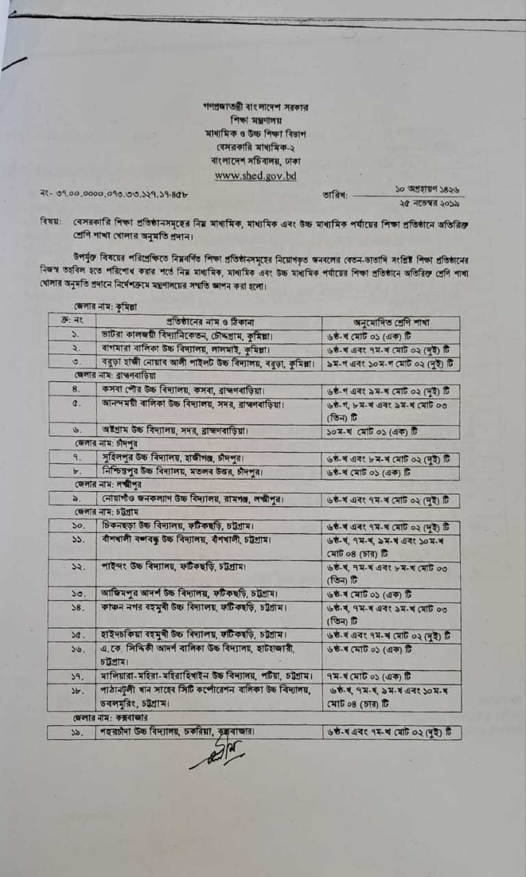 বিদ্যালয়ের অনুমোদিত শাখার তথ্য